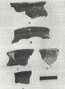 Based on analysis of the Late Woodland / Upper Mississippian pottery collected in the 1948 excavations, 2 distinct types of pottery wares were defined: Late Woodland grit-tempered Moccasin Bluff Ware (327 vessels) and Upper Mississippian shell-tempered Berrien Ware (48 vessels).[3]