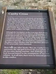 A memorial plaque and a reproduction of Canby's Cross have been set up at Lava Beds National Monument outside of Tulelake. The names of all the fallen (both Modoc and US Army) are listed at Gillem's Camp; another historical marker is at the Lava Beds.