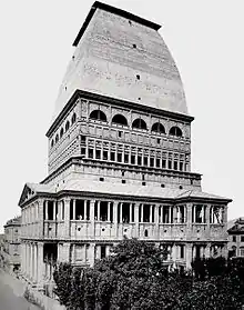 On May 23, 1953 a violent cloudburst, accompanied by a tornado, destroyed the uppermost 47 m (154 ft) of the pinnacle, which was rebuilt in 1961 as a metal structure faced with stone. Guido Chiarelli carried out the project for the lighting of the pinnacle, at the end of the reconstruction work.