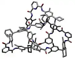 In chemistry, a molecular knot is a mechanically interlocked molecular architecture that is analogous to a macroscopic knot.[1] Naturally forming molecular knots are found in organic molecules like DNA, RNA, and proteins. It is not certain that naturally occurring knots are evolutionarily advantageous to nucleic acids or proteins, though knotting is thought to play a role in the structure, stability, and function of knotted biological molecules.[2] The mechanism by which knots naturally form in molecules, and the mechanism by which a molecule is stabilized or improved by knotting, is ambiguous.[3] The study of molecular knots involves the formation and applications of both naturally occurring and chemically synthesized molecular knots. Applying chemical topology and knot theory to molecular knots allows biologists to better understand the structures and synthesis of knotted organic molecules.[1]