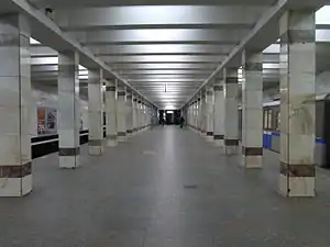 The station was designed by architect Rimidalv Pogrebnoy. It has the standard pillar-trispan design. The pillars are white marble with bands of pink marble at the top and bottom. The walls are tiled.
