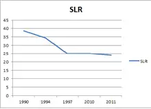 - Every financial institution has to maintain a certain quantity of liquid assets with themselves at any point of time of their total time and demand liabilities. These assets have to be kept in non cash form such as G-secs precious metals, approved securities like bonds. The ratio of the liquid assets to time and demand liabilities is termed as the Statutory liquidity ratio. There was a reduction of SLR from 38.5% to 25% because of the suggestion by Narsimham Committee. As on 9th October 2020, the SLR stands at 18%.[6]