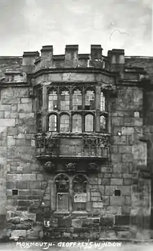 The monastic buildings were located on the north side of the priory church. Traces of an infirmary were discovered in 1906, when the site of the Baptist Church was being prepared for building. The surviving buildings were the prior's lodgings.[1] The only recognisable surviving medieval feature is the "sumptuous mid-C15 oriel window"[1] which is often erroneously described as having a connection with Geoffrey of Monmouth who lived over three centuries earlier,[7] and which in fact is likely to have formed part of the priory gatehouse.[1] The window contains three corbels in the form of carved heads of high quality, although there is some uncertainty as to exactly what they depict: Newman describing them as representing "an angel between a civilian and what may be a bedesman",[1] whilst Kissack is more empathic in suggesting they portray "a knight, an angel and a miller."[8] The prior's lodgings were extended on several occasions in the nineteenth century when they were used as St Mary's National School.[1]