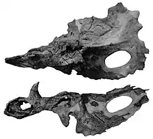 In 1998 Dodson and Allison Tumarkin argued that the bone structure could also be explained by species-specific pedomorphosis, the retention by adults of juvenile traits. This would be proven by the fact that the holotype of M. lowei, specimen NMC 8790, possessed an interparietal bone, at 609 millimetres in length the longest of any centrosaurine specimen known. The second longest, specimen NMC 5429 of Centrosaurus apertus, is only 545 millimetres long, showing NMC 8790 was not likely a subadult.[22] However, in 2006 Michael Ryan concluded that the M. lowei holotype was an exceptionally large subadult after all, as shown by a third epiparietal, osteoderm on the frill edge, just beginning to develop, and skull sutures which are not completely closed. Monoclonius crassus was seen as a nomen dubium.[2]