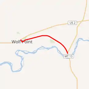 Highway 25's western terminus is at U.S. Route 2 in Wolf Point, Montana. The route heads northeast parallel to US 2 and a railroad. After bending southeastward, it passes the Lyman Clayton Airport and the Airport Golf Club, ending at Montana Highway 13, just to the north of the Missouri River.[2]