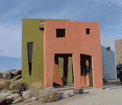 The dwelling is a modern, unique in design, and has been featured in numerous architectural books and magazines. The cubic shape, with trapezoidal openings, mirrors the surrounding landscape, which is dominated by fragmented monzogranite boulders. Building colors also reflect the surroundings with an orange gazebo found on some boulders and flowers. A drab olive from shrubs and cacti and blue colors mimic distant ridgelines and the sky.