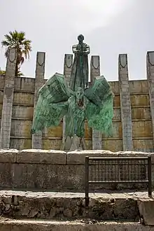 The monument is located at the crossroads of the Rambla de Santa Cruz and the avenida de Anaga.[2] The bronze sculptural group consists of a winged angel (an allegory of the Dragon Rapide, the airplane that transported Franco from the Canary Islands to the African mainland in order to kickstart the 1936 coup d'etat that marked the beginning of the Spanish Civil War) and a "saviour" male figure (representing Franco) standing over the angel while wielding a sword shaped like a Christian cross that points down.[3][4][5][6]