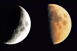 The usual English adjective pertaining to the Moon is "lunar", derived from the Latin word for the Moon, lūna. The adjective selenian /səliːniən/,[24] derived from the Greek word for the Moon, σελήνη selēnē, and used to describe the Moon as a world rather than as an object in the sky, is rare,[25] while its cognate selenic was originally a rare synonym[26] but now nearly always refers to the chemical element selenium.[27] The Greek word for the Moon does however provide us with the prefix seleno-, as in selenography, the study of the physical features of the Moon, as well as the element name selenium.[28][29]
