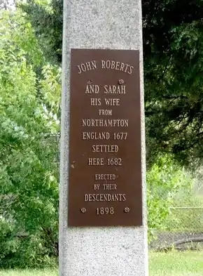 In 1682, John and Sarah Roberts became the first English-speaking residents of Moorestown when they began to live in their home where the Roberts Monument is presently located on County Route 537 at the intersection with Route 73.[28][29] In May 1686, three years after the founding of Philadelphia, John Rodman bought 500 acres (2.0 km2) on the west side of Chester Township, and Thomas Rodman bought 533 acres (2.2 km2) in the same area; this soon became known as the Village of Rodmantown. The growing area around the eastern spring was known as the Village of Chestertown.[30]