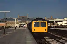 Promenade station survived the Beeching Axe, but by the late 1980s tourism in Morecambe was rapidly declining.[10] Traffic levels were significantly lower than they had been at their peak 30 years before, but the four platform, fully signalled, layout had remained largely unaltered and was far too large for the modest service (1-2 trains per hour) in operation. The local authority was keen to regenerate and redevelop the sea-front area surrounding the station and the adjacent Midland Hotel, so in 1993 the decision was taken to close Promenade Station and replace it with a new station situated slightly further inland and closer to the town centre. A final commemorative railtour visited the station the evening before its official closure on 7 February 1994.