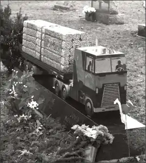 This gravestone is a Semi-trailer truck made of black granite. Inside the trucks trailer is a set of logs made of pink granite. The truck has all the details of a "real" truck - the cab has a relief of a driver inside, and wipers, handrails and exhaust pipes as well. It is unsigned by the artist.