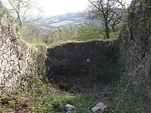In the 13th century the castle would have stood on the border between the Welsh Lordship of Senghenydd and the English Lordship of Glamorgan.[1] The lack of evidence of roofing materials or internal buildings at the site is interpreted to mean that the castle was never completed or occupied.[1][5] The battlements found by Ward have now disappeared, but the shape of the walls of towers and the presence of a newel post indicate a spiral staircase rising from the first floor. This would have been unusual in a Welsh castle. In addition, carved stones for doorways and windows suggest an English castle. Cadw argue that the castle must have been built by the English because of two factors related to a type of stone used in its construction, known as Sutton stone. Sutton stone was obtained from only one quarry that was depleted in the Middle Ages. According to Cadw, the castle could only have been built during the period that the quarry was in use. They also argue that only the English could have obtained the stone because the site of the quarry near Ogmore-by-Sea would have been defended by the de Clare family, at nearby Ogmore Castle, who opposed the Lord of Senghennydd.[1]
