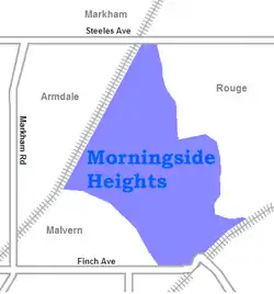 Morningside Heights is a suburban residential neighbourhood in the district of Scarborough in Toronto, Ontario, Canada. It is located in the northeast corner of the city, just north of the Malvern and west of Rouge Park and the Rouge. The subdivision, comprising approximately 750 acres (3.0 km2), was one of the last large tracts of undeveloped land within the City of Toronto, located between Finch Avenue East and Steeles Avenue East, from Tapscott Road to the Rouge River.[1]