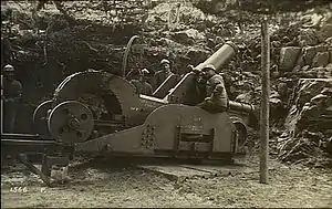 Since aircraft of the period were not yet capable of carrying large diameter bombs the burden of delivering heavy firepower fell on the artillery. The combatants scrambled to find anything that could fire a heavy shell and that meant emptying the fortresses and scouring the depots for guns held in reserve. It also meant converting coastal artillery and naval guns to siege guns by either giving them simple field carriages or mounting the larger pieces on rail carriages.[2]