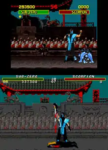 Boon later said, "since the beginning, one of the things that's separated us from other fighting games is the crazy moves we've put in it, like fireballs and all the magic moves, so to speak."[17] According to Tobias, the game's ultraviolent content had not been originally intended and was only implemented gradually as the development progressed.[18] The concept of Fatalities in particular evolved from the "dizzied" mechanic in earlier fighting games. Boon said that he hated the "dizzied" mechanic, but that it was fun to have one's opponent get dizzied and get in a free hit. Boon and Tobias decided they could eliminate the aggravation of getting dizzied by having it occur at the end of the fight, after the outcome had already been decided.[19] An early version of the game used two more buttons for middle punch and kick attacks.[20]