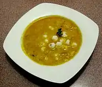 Mote (from Quechua: mut'i, through Spanish mote) is the generic name for several varieties of corn grains boiled, consumed in many regions of South America. It is usually prepared by boiling the grains in water made alkaline by the addition of ashes or lime, a process known as nixtamalization.