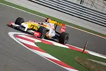 Lewis Hamilton and Jenson Button of McLaren and the Red Bull pair of Sebastian Vettel and Mark Webber were Alonso's main championship competition.[102] He won the season-opening Bahrain Grand Prix and Ferrari favoured him over Massa after his teammate did not allow him past in Australia.[91] Alonso fell 47 points behind after the British Grand Prix due to driver errors in China and Monaco and a slow progression of development into the F10 of which he reportedly grew frustrated with.[103][104] His second race victory came when Ferrari instructed Massa to let him win in Germany.[91] Victories in Italy, Singapore and Korea and finishing in the top three each time thereafter allowed Alonso to enter the season-ending Abu Dhabi Grand Prix leading by eight points.[103] He finished second to Vettei with 252 points after a strategy error by Ferrari left him behind and unable to pass Vitaly Petrov's Renault.[4][103]