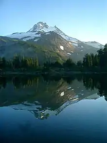 Other geographic features at Jefferson include rock outcrops, steep talus slopes, conifer forests, and alpine meadows.[11][12] Additionally, a number of rivers drain Mount Jefferson. The northern and northwestern slopes feed the South Fork Breitenbush River, which flows into Detroit Lake, and the eastern side of Detroit Lake also receives water from Whitewater Creek, Russell Creek, and Milk Creek, which flow from the western flank of Mount Jefferson.[21] The Whitewater Glacier and the northeastern side of the volcano drain into the Whitewater River, and Shitike Creek flows between Mount Jefferson and Olallie Butte before reaching the Deschutes River.[22] Both Jefferson and Parker Creeks receive water from Jefferson's southeastern slopes, then join the Metolius River.[23]