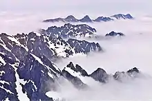 The Olympic Mountains are composed of obducted clastic wedge material and oceanic crust, primarily Eocene sandstone, turbidite, and basaltic oceanic crust.[6] The mountains were sculpted during the Pleistocene era by erosion and glaciers advancing and retreating multiple times.