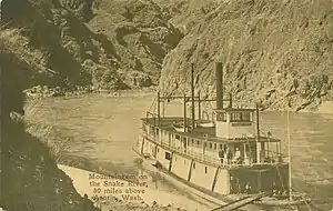 In mid-October 1904, Captain William P. Gray took Mountain Gem upriver from Lewiston.[10] Originally it had been intended to take the steamer as far as the Wild Goose Rapids, but river conditions prevented the boat from going farther than Grand Ronde.[10] Recent heavy storms had caused landslides into the river, creating additional rapids.[10]