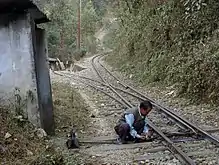 Important features incorporated in the line include four loops (spirals) and four 'Z' reverses (zigzags). The introduction of bogie carriages allowed for the replacement of the basic four wheel carriages formerly used for support and stability. In 1897, a major earthquake damaged the railway, requiring rebuilding of the route, including extensive improvements to the track and stations. Further modernization occurred as part of the Northeast Frontier Railway Zone. Most trains on the route are still powered by steam engines, but a modern diesel engine is used for the Darjeeling Mail train.[4][6][7] The railway is notable for its signage located at key vantage points, marking locations with titles such as Agony Point and Sensation Corner. Another feature are spirals on steep hills that provide scenic views of the valleys below.[8]