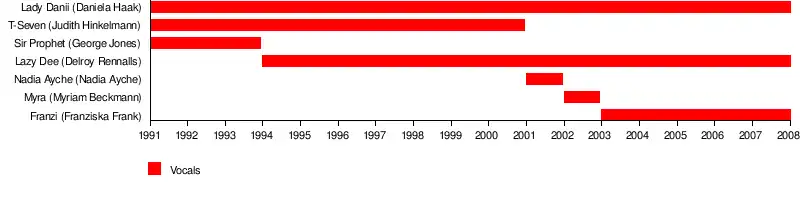 | Past members | Delroy Rennalls (LayZee) Judith Hinkelmann (T-Seven) Daniela Haak (Lady Danii) George Jones (Sir Prophet) Myriam Beckmann (Myra) Franziska Frank (Franzi) Nadia Ayche |