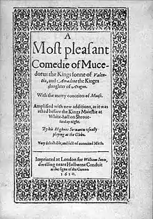 A Most pleasant Comedie of Mucedorus the Kings Sonne of Valentia, and Amadine the Kinges daughter of Aragon, commonly called Mucedorus, is an Elizabethan romantic comedy, first performed around 1590 and regularly revived until the Restoration. It was one of the most performed plays of its age,[1] and 16 quarto editions were published between 1598 and 1668 making it the most widely printed play from the time. It was performed for both Queen Elizabeth and King James I. A revised and expanded version was published in 1610 with additional scenes.