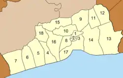 The district is divided into 18 subdistricts (tambons), which are further subdivided into 116 villages (mubans). Samut Sakhon itself has city status (thesaban nakhon) and covers the three subdistricts Maha Chai, Tha Chalom, and Krokkrak. Bang Pla is a subdistrict municipality (thesaban tambon) which covers parts of the same-named subdistrict. Three other subdistricts completely form a subdistrict municipality: Na Di, Bang Ya Phraek and Tha Chin. The non-municipal area is administered by 12 tambon administrative organizations (TAO).