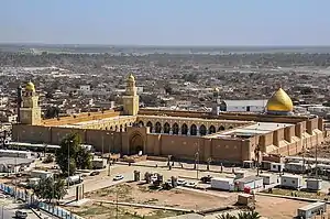 In 687, Mus'ab ibn al-Zubayr, the governor of Basra and younger brother of Abd Allah ibn al-Zubayr, launched an assault against Kufa. A sizable portion of his army consisted of Kufan nobles, who had previously fled Mukhtar's punitive measures.[27] The size of Mukhtar's Kufan army is not certain with ranges between three thousand to sixty thousand, depending on the source.[45] The Kufans retreated following their defeat at the battles of Madhar, located along the Tigris between Basra and Kufa, and Harura, a village near Kufa.[46] Mus'ab then besieged Mukhtar's palace for four months. Ibn al-Ashtar, who was then governor of Mosul, did not attempt to relieve Mukhtar, either because he was not called to action,[47] or because he refused Mukhtar's summons.[48][49] In either case, he later joined Mus'ab.[47] On 3 April 687, Mukhtar came out of the palace accompanied by nineteen supporters, (the remainder had refused to fight), and was killed fighting.[50] Soon afterward, Mukhtar's remaining partisans, totaling about six thousand, surrendered and were executed by Mus'ab.[27] One of Mukhtar's wives, Umrah bint Nu'man ibn Bashir al-Ansari, refused to denounce her husband's views and was consequently executed,[51] while his other wife condemned him and was spared. Mukhtar's hand was cut off and hung on the wall of the mosque.[52] His grave is, reportedly, located inside the shrine of Muslim ibn Aqil, at the back of the Great Mosque of Kufa.[53] Some sources, however, state that Mus'ab had burned his body.[54]
