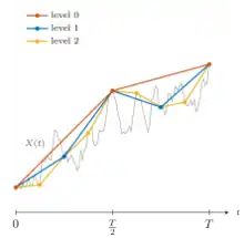 The first application of MLMC is attributed to Mike Giles,[2] in the context of stochastic differential equations (SDEs) for option pricing, however, earlier traces are found in the work of Heinrich in the context of parametric integration.[3] Here, the random variable is known as the payoff function, and the sequence of approximations , use an approximation to the sample path with time step .