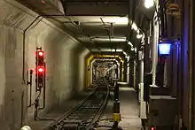 The backbone of the system is formed by two interconnected subway tunnels, the older Twin Peaks Tunnel and the newer Market Street subway, both controlled by automatic train operation systems to run trains with the operators closing the door to allow the train to pull out of a station. This ATO system was upgraded in 2015 to replace outdated software and relays.[56] The tunnels, 5.5 miles (8.9 km) in total length,[6] run from West Portal Station in the southwestern part of the city to Embarcadero Station in the heart of the Financial District. Three lines—the K Ingleside, the L Taraval, and the M Ocean View—feed into the tunnel at West Portal, while two lines, the J Church and N Judah, enter at a portal near Church Street and Duboce Avenue in the Duboce Triangle neighborhood. Two lines, the N Judah and T Third Street, enter and exit the tunnel at Embarcadero. An additional tunnel, the Sunset Tunnel, is located near the Duboce portal and is served by the N.