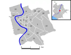 Since 2013 the territory includes all 22 rioni: R.I Monti, R.II Trevi, R.III Colonna, R.IV Campo Marzio, R.V Ponte, R.VI Parione, R.VII Regola, R.VIII Sant'Eustachio, R.IX Pigna, R.X Campitelli, R.XI Sant'Angelo, R.XII Ripa, R.XIII Trastevere, R.XIV Borgo, R.XV Esquilino, R.XVI Ludovisi, R.XVII Sallustiano, R.XVIII Castro Pretorio, R.XIX Celio, R.XX Testaccio, R.XXI San Saba and R.XXII Prati.