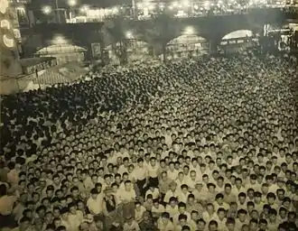 Rikidōzan's funeral was held on December 20, 1963, in Ikegami Honmonji Temple in Ōta, Tokyo. Numerous figures from the worlds of politics, cinema and sports attended, as well as fans and members of the public, with the number of people reportedly exceeding 12,000 people. It is said that the row of people stretched over 500 meters from the temple all the way to Ikegami train station.[7][8] Among those in attendance were Rikidōzan's students, Antonio Inoki, Giant Baba and Kintaro Ohki as well as various other opponents from throughout his career.