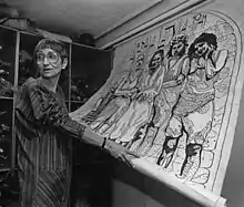Muriel Nezhnie Helfman (February 28, 1934 – April 9, 2002), known professionally as Nezhnie, was an American artist, primarily weaving large tapestries throughout 1956–1992. She gained international attention in the late 1980s with a series of six tapestries, Images of the Holocaust, completed between 1979 and 1989. They were first exhibited as a series at the "Sazama-Brauer Gallery" in Chicago in 1988. Their imagery and texts are based on historical photographs of victims of Nazi persecution, such as ones by Mendel Grossman, and other materials that Nezhnie collected from the Library of Congress, National Archives, the Pentagon and the Yad Vashem Archives in Israel.