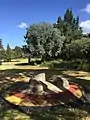 Colourful sculptures tower above the Murrumbeena Community Garden beds (planted with a variety of vegetables, sunflowers and Indigenous herbs) and painted furniture at Anthony Breslin's Community Art Project. The surrounding walls feature works of Breslin (including frogs) and other local artists, an extensive mural wall displays hundreds of tiles created by local primary school students, and a sustainable water garden feature sits alongside the shed. It is reached via the driveway of Murrumbeena Uniting Church, 117 Murrumbeena Road.