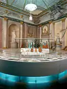 The Palazzo Sanguinetti decorations displays works by major 18th- and 19th-century Neoclassical painters, such as Pelagio Palagi (1777–1860), Serafino Barozzi, and Antonio Basoli (1774–1848), under the direction of Vincenzo Martinelli (1737–1807). On the ground floor, the landscape fresco (a magnificent trompe-l'oeil perspective) is attributed to Luigi Busatti, while the quadratura is the work of Francesco Santini (1763–1840). Santini, with the probable collaboration of Serafino Barozzi (1735–1810), also decorated the walls of the grand staircase. On the first floor, the Woodland Room (Room 1), used as and called the Banquet Room, was designed by Martinelli: he illustrates landscapes rich with greenery and classical architecture in the distance. These classical elements surround the onlooker in the illusion of a step that supports hermes and statues of Bacchus and Ceres, works by a young Palagi.[1] The Aeneas Room (Room 2), also by Palagi, depicts stories of the Aeneid on a black, Etruscan background. The Zodiac and Aurora Room (Room 3) depicts the Zodiac signs by Domenico Corsini (1774–1814) and a figure of Aurora, attributed to Palagi. The last small room of the east wing (Room 4) is decorated by artists from the Barozzi workshop. They are also credited with the two rooms (Rooms 6 and 7) that conclude the west wing, which are decorated in oriental style with curtains and pavilions, exotic plants, and feminine figures with small umbrellas. Room 5 is the Ballroom. At the end of the museum tour are two salons in the apartment designed by Aldini; they were the first two rooms to be decorated. The original room (Room 8), is decorated by Antonio Basoli in a neo-gothic style, with figures, statues, and bass reliefs by Pietro Fancelli (1764–1850).