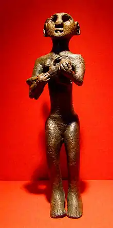 - Early Bronze Age (3000-1950 BC): The people of Anatolia amalgamated copper and tin and invented bronze at the beginning of the 3000 BC. They also processed the known metals with casting and hammering techniques. In addition to valuable metal artifacts buried as grave goods in royal tombs in Alacahöyük, artifacts from Hasanoğlan, Mahmatlar, Eskiyapar, Horoztepe, Karaoğlan, Merzifon, Etiyokuşu, Ahlatlıbel, Karayavşan, Bolu, Beycesultan Semahöyük, Karaz-Tilkitepe are represented in the Old Bronze Age section of the museum. The Hatti tribes dominate the Bronze Age display. The collection includes solar discs, deer-shaped statuettes, thinner version of female figurines and gold jewelry. There is also a reconstruction of a burial ceremony which emphasizes the religious practices of this ancient people.