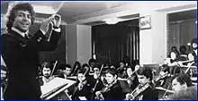 Ali-Naqi Vaziri, a respected player of numerous Iranian and western instruments who studied western musical theory and composition in Europe, was one of the most prominent and influential musicians of the late Qajar and early Pahlavi periods. He established a private music school in 1924, where he also created a school orchestra composed of his students, formed by a combination of the tar and some western instruments. Vaziri then founded an association named Music Club (Kolub-e Musiqi), formed by a number of progressive-minded writers and scholars, where the school orchestra performed concerts that were conducted by himself. He was an extraordinary figure among the Iranian musicians of the 20th century, and his primary goal was to provide music for ordinary citizens through a public arena.[13] The Tehran Symphony Orchestra (Orkestr-e Samfoni-ye Tehrān) was founded by Gholamhossein Minbashian in 1933.[14] It was reformed by Parviz Mahmoud in 1946, and is currently the oldest and largest symphony orchestra in Iran.[15] Later, Ruhollah Khaleqi, a student of Vaziri, established the Society for National Music (Anjoman-e Musiqi-ye Melli) in 1949.[16] Numerous musical compositions were produced within the parameters of classical Iranian modes, and many involved western musical harmonies. Iranian folkloric songs and poems of both classical and contemporary Iranian poets were incorporated for the arrangement of orchestral pieces that would bear the new influences.[16]