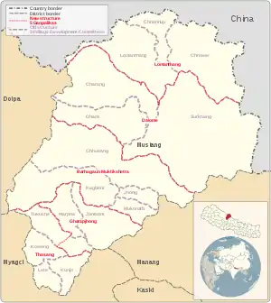 Mustang District was a part of Dhaulagiri Zone in Nepal's Western Development Region.[14] In 2017, Ministry of Federal Affairs and Local Development (Nepal) re-structured the area into five Gaunpalikas or rural municipalities with five areas each, which are different from old VDCs.[43][44][45][46] Since establishment of Kingdom of Mustang until restructuring of local governance of Nepal, the area of this district was divided into one parliamentary constituency, nine Ilakas, and 16 Village Development Committees (VDCs).[14] While an Ilaka functioned as the local development unit, the VDCs functioned as local political units.[3][10]