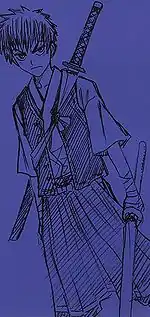 Yahiko starts off as arrogant and bad-mannered; he had already bestowed upon himself the title "Tokyo Samurai", as his father was a samurai who died during the Battle of Ueno in the Boshin War, slain at the Keneiji Temple.[8] Because Yahiko respected his parents, he becomes a thief before the start of the series, to pay back their debt. Yahiko first appears trying to rob Kenshin, who stops him but lets him go. As his yakuza bosses are about to beat him to death for his desire to quit, Kenshin arrives to save him and take him to Kaoru's dojo to learn swordsmanship.[8] Yahiko's dream is to be as strong as Kenshin so he will be able to protect himself and the people he loves.[9] Despite his young age and his short time of training, as the series continues Kenshin allows Yahiko to fight with him, noting that he is too mature for his age.[10] He becomes a witness to many of Kenshin's later battles[11] to the point which Yahiko becomes adept at imitating some of Kenshin's Hiten Mitsurugi-ryū (飛天御剣流, lit. "Flying Heaven Honorable Sword Style") techniques, combining them to perform many other powerful sword techniques.[12][13] Yahiko also learns the principles of Kamiya Kasshin-ryū (神谷活心流, lit. "Gods' Valley Alive Heart Style"), which matches Kenshin's ideal of saving lives. When Kenshin goes to Kyoto to fight Shishio Makoto who wanted to conquer Japan, Yahiko accompanies Kaoru to find and aid Kenshin.[14] While Kenshin goes to have his final fight against Shishio, he stays in Kyoto to defend their base, a hotel named Aoi-ya, from Shishio's forces along with Kaoru and the Oniwabanshū.[15] They are successful in doing it, and Yahiko manages to defeat one of Shishio's strongest soldiers, Henya.[12]