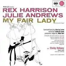 The Broadway cast recording of the musical My Fair Lady was released as an album on April 2, 1956.[2] The songs were composed by Frederick Loewe with lyrics by Alan Jay Lerner and conducted by Franz Allers, while the cast included stars Julie Andrews and Rex Harrison. The album became a massive seller, topping the charts on the US Billboard 200 for fifteen weeks at different times in 1956 (eight consecutive weeks), 1957, 1958 and 1959.[1] In the UK, upon its release in 1958, the album reached No.1 for 19 consecutive weeks and became the biggest-selling album of the year.[3] The album was released on Columbia Records, whose President, Goddard Lieberson provided the $375,000 needed to stage the show in return for the rights to the Cast recording.[2] The album was later re-issued on Compact disc in 1988 and has been re-released a number of times since.[4] It is currently available with bonus tracks. The original cast recording had the (currently in 2018) 5th longest run ever for any album in the Billboard 200 charts with 480 weeks. The leads of the Broadway cast re-recorded their parts for the London cast recording, which was made in stereo in 1959.[5]