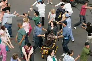 Then, the scene changes to J.D. and Elliot in the park, when a woman, Patti Miller (D'Abruzzo), abruptly falls unconscious. As she returns to consciousness, she sees Elliot, J.D., and a worried group of onlookers singing to her ("All Right"). When she tries to respond, she sings too. In reality, no one is actually singing; Ms. Miller is hallucinating. She drifts out of consciousness, and wakes up being wheeled out of an ambulance in the parking lot of Sacred Heart Hospital, with all the hospital employees singing to her, "Welcome to Sacred Heart," led by Dr. Kelso.