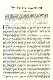 "My Platonic Sweetheart" is a short dream narrative written by American writer Mark Twain. It was originally titled "The Lost Sweetheart" and written during Jul–Aug 1898, but only published in late 1912.[2] The main character (believed to represent Twain) has several dreams throughout his life about the same woman.[3] The narrative depicts five of these dreams, and in each dream the main character and the woman take on different names. The woman's appearance (hair and eye color) also changes in each dream. However, the characters' ages in the dreams remain the same, he is seventeen and she is fifteen, and the two characters never fail to recognize each other.