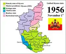 In 1956, the Government of India effected a comprehensive re-organisation of provincial boundaries, based upon the principle of shared language. As a result of the States Reorganisation Act on 1 November 1956, the Kannada-speaking districts of Belgaum (except Chandgad taluk), Bijapur, Dharwar, and North Canara were transferred from Bombay State to Mysore State.[4] Bellary district was transferred from Andhra State. South Canara was transferred from Madras State and the Koppal, Raichur, Gulbarga and Bidar districts from Hyderabad State. Also, the small Coorg State was merged, becoming a district of Mysore State.[5][6] The state was renamed Karnataka on November 1, 1973.[7]