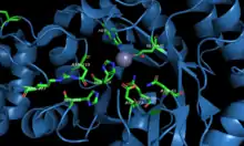 Amidohydrolase enzymes can bind one, two, or three metal atoms in the active site. These metals can include Zn2+, Co2+, Fe2+, Cd2+, and others.[1] EcNagA contains a mononuclear metal-binding site with a Zn2+ ion;[3] in addition, EcNagA shows a phosphate ion bound at the metal-binding site.[7] Unlike EcNagA, NagA of Mycobacterium smegmatis (MSNagA) and Bacillus subtilis (BsNagA) have binuclear metal-binding sites. MSNagA has two divalent metal ions located in each active site, which are both required for efficient catalysis and structural stability.[6] While most other bacteria species use Zn as their metal co-factor, BsNagA utilizes iron as the predominant metal in the metal-binding site.[9]
