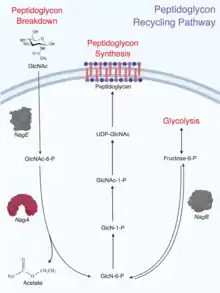 In the PG Recycling pathway, once GlcNAc-6-P is metabolized by NagA, its product, GlcN-6-P, can then be converted to GlcN-1-P by the enzyme GlmM, followed by reacetylation and reaction with UTP by GlmU to form UDP-GlcNAc.[10][11] UDP-GlcNAc is the end product of this pathway, which is then used to make glycosaminoglycans, proteoglycans, and glycolipids, which are all necessary in order to replenish PG for the cell wall.[12] PG recycling is necessary for bacterial cells in order to ensure bacteria growth and prevent cell lysis.[13]