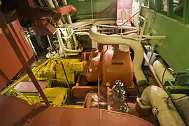 The main machinery room measures 55 feet (17 m) long by 78 feet (24 m) wide and 32 feet (9.8 m) high. The main control room is immediately aft of the machinery room, from which engineers controlled both the reactor and the steam propulsion plant. A window separates the control room from the machinery room. The control room is visible from the viewing gallery on "C" Deck above. The steam plant is a relatively standard steam plant in its general characteristics, with a nine-stage high-pressure turbine and a 7-stage low-pressure turbine driving a single propeller shaft. The turbines were specially adapted to use the saturated steam typically provided by a nuclear power source. It was also unusual in having a 750 hp electric motor geared to the high-pressure turbine for use in an emergency. The motor was driven by either the ship's steam turbogenerators or the 750 KW emergency diesel generators located in the rear of the pilothouse. These generators could provide basic propulsion to the motor while running the reactor coolant pumps. The motor was upgraded to provide greater torque and reversibility to allow it to move the ship away from a pier in the event of a reactor accident.[9]