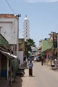 It is believed that 60 percent of the shrines were built by Hindus[7] Pratap Singh (1739–1763 A.D.), the Hindu Maratha ruler of Thanjavur, built the one of the five and tallest minaret (periya manara)[1] with a height of 131 feet. This minaret is located on the west face just outside the main darwaza.[8] This was erected 195 years after Shahul's era.[5] As a mark of respect people also Venerate the sandals of the saint which are preserved in the shrine. The central part of the dargah is the tomb of the saint, Shahul Hamid, who is a direct descendant of Mohammed, through his grandson Hassan, through Abdel Khader Gilani, Sultanul Awliya, and approached through seven thresholds (four made of silver and three of gold). The saint also known as "Ganj e Sawai" meaning the doorway of one and a quarter. Whosoever asks will be bestowed with plenty "Barakah" as per the custom of giving a little more. Since the saint was celibate he is offered a "Sehra", and not the customary chadar of flowers as at other dargahs. He was approached by a childless couple who were told they would be blessed with children but the first offspring would he his, meaning would be presented to him to adopt. There is a shrine for Shahul's adopted son Yusuf and wife Ceytu Sultan (Sayid Sultan) Bibi. The doors of the shrines are open only during early morning and evening.[7] Currently there are approximately 1500 male descendants, who are called Mujawars. There is a hereditary Khalifa, from among the descendants of the saint Yusuf (the adopted son, who is a saint in his own right). He is recognised as the first hereditary khalifa, the first born of the first born. This khalifa performs all the official religious duties. The work of administration and maintenance is the responsibility of a committee who operate under a scheme decreed by the Madras High Court.
