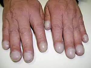 Nail clubbing, also known as digital clubbing or clubbing, is a deformity of the finger or toe nails associated with a number of diseases, mostly of the heart and lungs.[2][3] When it occurs together with joint effusions, joint pains, and abnormal skin and bone growth it is known as hypertrophic osteoarthropathy.[4]