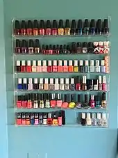 Nail polish (also known as nail varnish or nail enamel) is a lacquer that can be applied to the human fingernail or toenails to decorate and protect the nail plates. The formula has been revised repeatedly to enhance its decorative effects and to suppress cracking or peeling. Nail polish consists of a mix of an organic polymer and several other components that give it its unique color and texture.[1] Nail polishes come in all shades of color and play a significant part in manicures or pedicures.